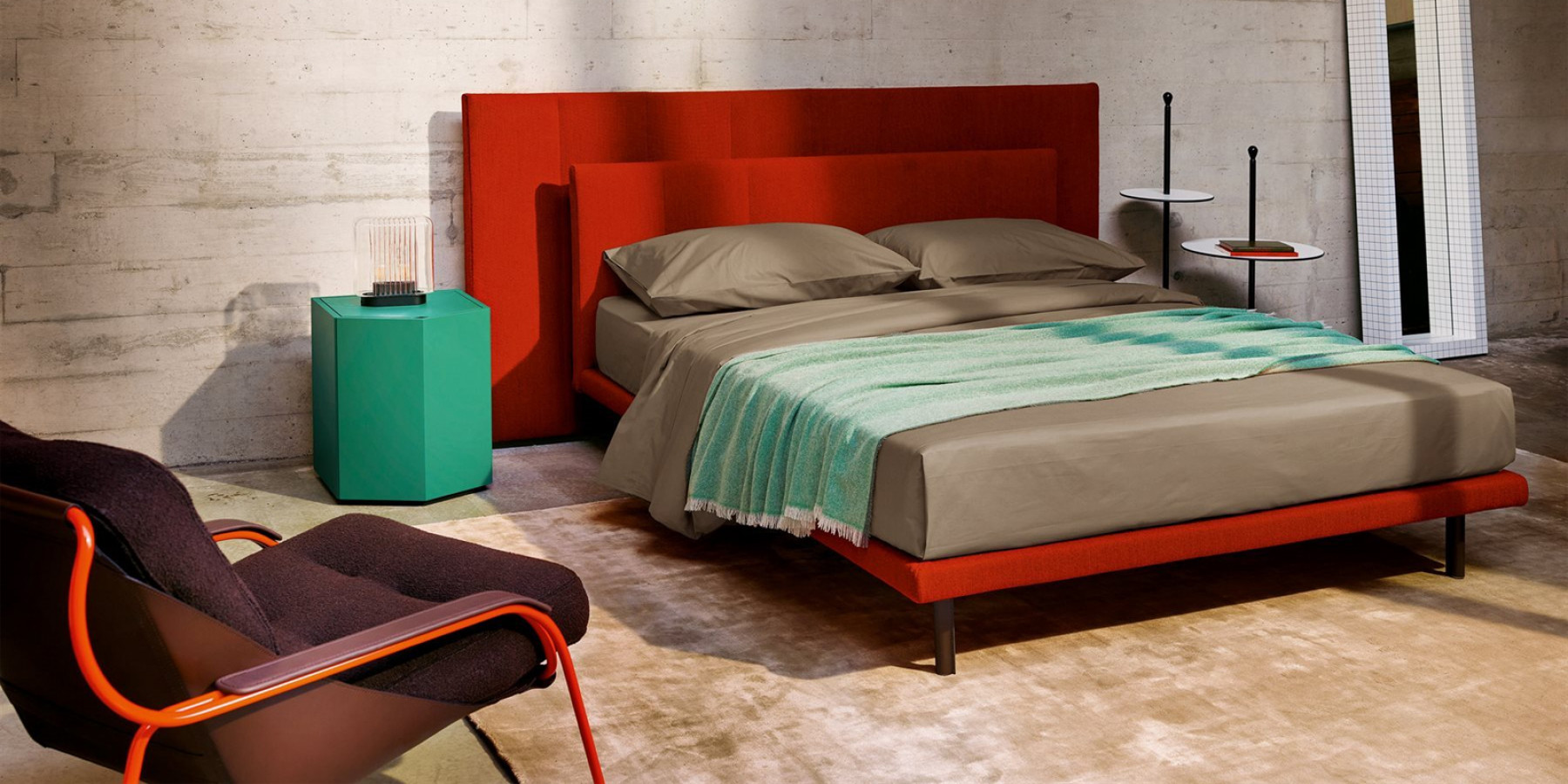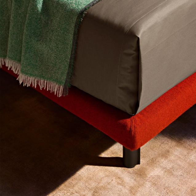 Steel feet and shelves covered with cowhide pigmentato 90. Steel frame with suspension on natural bent beech strips. Base and headboard upholstered in polyurethane/heatbound polyester fibre. Removable fabric or leather cover. Upon request the bed sizes for 210 cm. and 220 cm. long mattresses are available.