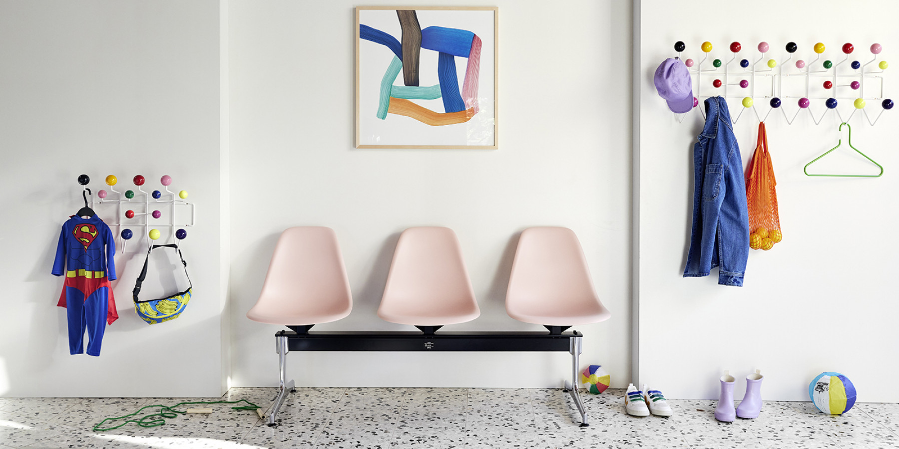The 'Hang it all' coat rack designed by Charles and Ray Eames, which comes in a variety of colour combinations, encourages children to literally hang up all their things. With its colourful wooden balls, 'Hang it all' is a cheerful alternative to conventional coat hooks – and not just in children's rooms.